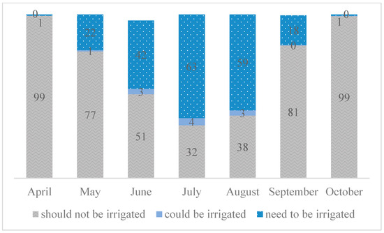 According to Figure 2 and Table 1, it is evident that June, July, and August have the highest number of days when irrigation needs to be applied (42%, 63%, and 59%, respectively). The results show that the transitional period among seasons (May and September) still has a need for irrigation (~20% of the days/months). This indicates that climate conditions in these months tend to be dryer, with less precipitation necessary for plants growing. An artificial water supply will be more frequent, leading to higher pressure on water resources. On the other hand, results for June show that there are a higher number of days that should not be irrigated. This can be explained due to the recent climate changes and irregular distribution of precipitation in the research area during the investigated period.