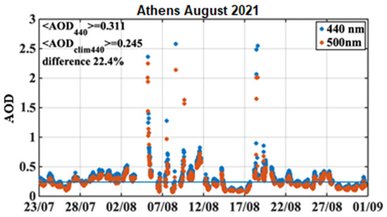 In August 2021, significant wildfires took place in northern Euboea, Peloponnese and Attica. Very high aerosol concentrations were measured in the Greater Area of Athens (GAA) based on Aerosol Optical Depth (AOD) Level 1.5 data from AERONET (Figure 1).