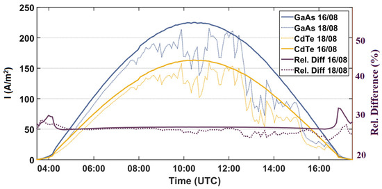 The spectral responses, SR (A W−1), of the two aforementioned technologies (GaAs, and CdTe) were considered in order to observe their performance under aerosol-free (e.g., 16 August 2021) and high-AOD conditions (e.g., 18 August 2021) when the air quality over the city of Athens was burdened by wildfires that occurred in the surrounding areas [3]. Their performance was calculated using Equation (1) and is illustrated in Figure 3. The relative difference between the two technologies for the two cases was calculated using Equation (2) and is shown in the same figure (right y-axis):
