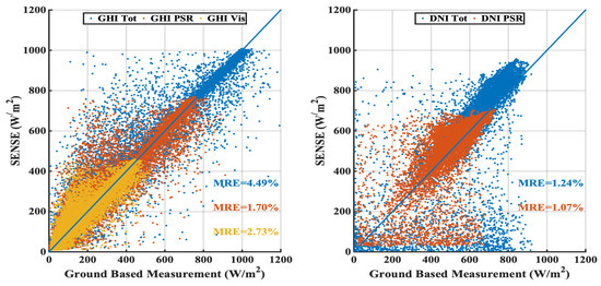 SENSE nowcasting estimations of GHI (left) and DNI (right) at different spectral regions against ground-based measurements of the same variables, for the whole duration of the ASPIRE campaign. Mean relative error (MRE) is also shown as percentage.