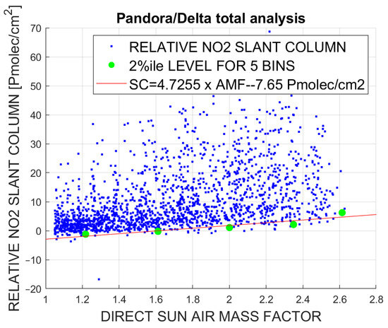 For the Bootstrap method, the relative slant columns are binned with respect to AMFs and the average of the lowest 2nd percentile in each bin is plotted against the corresponding AMFs. The bin size was chosen to be 0.4 units of AMFs. The slant column density of the reference day, SC