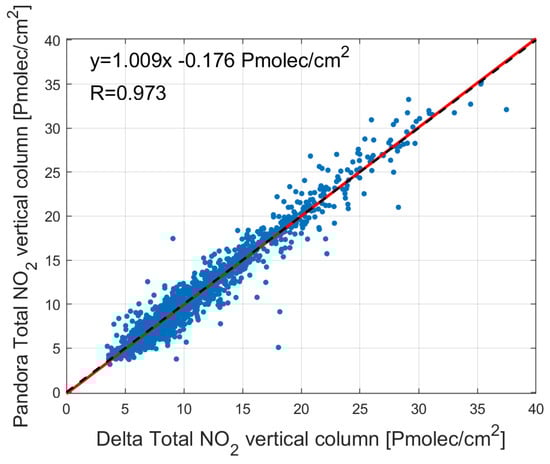 A methodology for the calculation of the total NO2 column density for a research-grade DOAS system (Delta) operating in Thessaloniki at the Laboratory of Atmospheric Physics, AUTH, was presented. The data from this system were compared to data from a collocated Pandora system that has been operating since September 2022. The comparison of the total ΝO2 vertical column densities between the Pandora and the Delta systems shows a good agreement, taking into account that the two systems are completely independent. As the Pandora system has been validated before delivery in the frame of the Pandonia Global Network, their achieved agreement suggests that the Delta system is reliable regarding its setup and operation, and, along with other products, it can be used to reliably monitor the NO2 total column amounts in Thessaloniki.