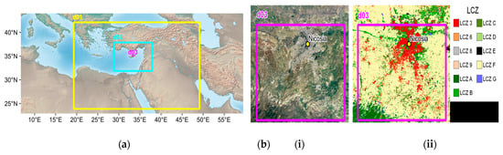 Two different simulations were performed with both the Noah-MP as a Land–Surface Model (LSM), which was found to be closer to the observations for the Middle East and North Africa (MENA) region according to [18]. The first one uses the Bulk urban scheme and the default Land Use/Land Cover (LU/LC) of the Moderate Resolution Imaging Spectroradiometer (MODIS) with 30s resolution. In the second one, to improve the representation of Nicosia’s urban characteristics, the WRF model was coupled with the SLUCM using a LCZ classification map for the LU/LC data. Among the different approaches to deriving a LCZ classification map, the WUDAPT level 0 methodology was used in this study, to produce the scheme introduced by [13]. The LCZ map was developed and created for the city of Nicosia and had a 100 m spatial resolution, illustrated in Figure 1b(ii). The map can be freely accessed at https://lcz-generator.rub.de/factsheets/8203d449c11ea097b3943aa2cff7cd82a55e2b05/8203d449c11ea097b3943aa2cff7cd82a55e2b05_factsheet.html (accessed on 3 July 2022). Next, it was aggregated to 1km resolution so that it could be inserted into the WRF model. Table 1 shows the main parameterizations used for both simulations and for all domains.