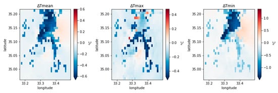 The WRF output of Tmean, Tmax, and Tmin was derived for each day, grid cell, and urban parameterization scheme. The temporal average of differences between the 2 schemes for the studied period over the smallest domain was derived separately for each variable by subtracting the value of the Bulk from the corresponding one of the SLUCM (. The obtained results for the temporal average of differences in Tmean (left), Tmax (center) and Tmin (right) are illustrated in Figure 2 below.