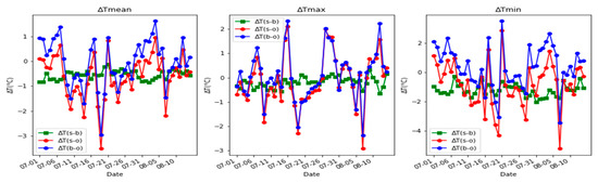 Temporal average of differences in Tmean (left), Tmax (center), and Tmin (right) between the two urban schemes. The differences were derived by subtracting the value of the Bulk from the corresponding one of the SLUCM.
