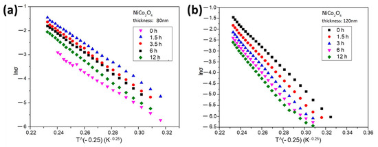 The In σ = f(T−0.25) measurements for (a) 80 nm thickness of NiCo2O4 film and (b) 120 nm thickness of NiCo2O4 film, heated at 70 °C under ambient air conditions for aging times 0, 1.5, 3, 6 and 12 h, respectively.