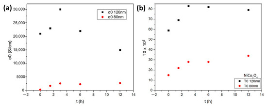 We investigated the electrical properties of the material using D.C. conductivity studies. The D.C. conductivity of NiCo2O4 films of 80 nm (Figure 1a) and 120 nm (Figure 1b) thickness was examined in the temperature range of 100 to 340 K. The thermal treatment of the samples took place at 340 K for 1.5, 3, 6, and 12 h. By increasing the time of thermal aging, a shift of the curve to lower conductivity values appears, which indicates that this “soft thermal treatment” has a measurable impact on the conductivity and is thus attributed to internal structural change.
