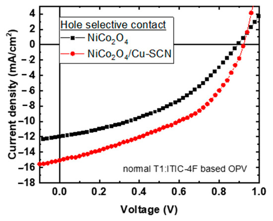 Light J-V curves of T1:ITIC-4F based OPVs with NiCo2O4 (black square) and NiCo2O4/Cu-SCN (red cycles) as hole transporting layers.