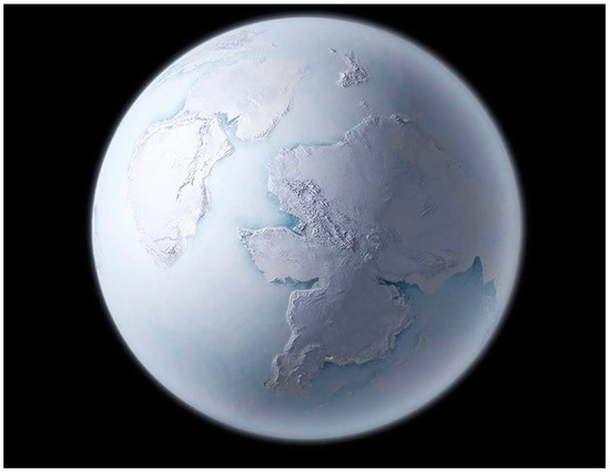 The Snowball Earth phenomenon describes a global climate characterized by extremely low temperatures and the entire surface of the planet being covered in ice, i.e., from the poles to the equator (Figure 1). In this state, the reflectivity of the Earth’s surface significantly increases, and most solar radiation is reflected back into space from the frozen surface, resulting in a high albedo effect that further amplifies the cold climate. The global average temperature during this period is estimated to be approximately −50 °C, with even lower temperatures reaching −20 °C at the equator, resembling the current temperature of Antarctica. The Snowball Earth hypothesis is rooted in compelling findings that indicate intense and successive climatic fluctuations occurred during the Neoproterozoic Era [1] These fluctuations have been inferred from various sources, including geological records, isotopic compositions, and sedimentary deposits, providing valuable insights into the climatic conditions and environmental changes that shaped our planet’s history.