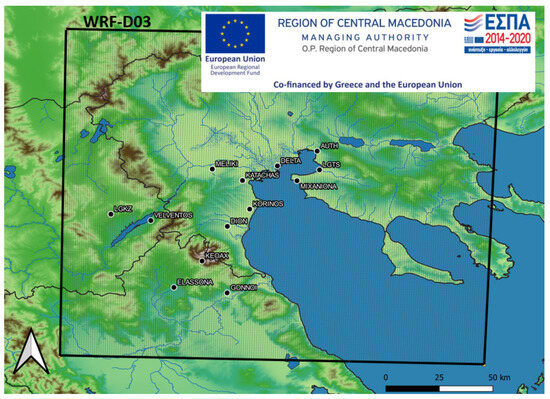 - Pytharoulis, I.; Kartsios, S.; Kostopoulos, V.; Spyrou, C.; Tegoulias, I.; Bampzelis, D.; Zanis, P. The high-resolution numerical weather prediction system of Agroray project. In Proceedings of the 16th International Conference on Meteorology, Climatology and Atmospheric Physics (COMECAP2023), Athens, Greece, 25–29 September 2023. [Google Scholar]