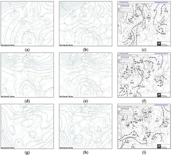 Geopotential height (solid lines) and temperature (dotted lines) at 00:00 UTC on 13/3/2016 for 500 hPa (a), 850 hPa (b) and sea surface pressure (c). The same for 16/11/2017 (d–f) and 25/3/2018 (g–i). (Source: University of Wyoming and U.K. Met Office).