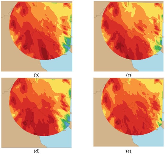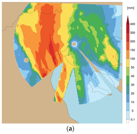 Figure 3 depicts the accumulated precipitation for 48 h (from 15 November 17 00:00 UTC to 16 November 17 23:59 UTC) estimated using the weather radar (Figure 3a) and the four different model experiments (Figure 3b–e). Most of the precipitation estimated from the radar data and simulated by all the WRF experiments appears in the western part of the domain, covering Pieria. Levs80-wrf produces smaller areas with very intense precipitation (>200 mm/48 h, 300 mm/48 h) than the other experiments, and so it is closer to the radar data.