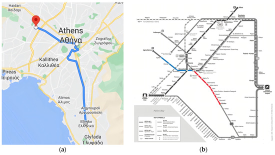 Map showing location of starting point at Elliniko station (grey dot), Syntagma station (white dot), and Egaleo station (red marker) (a). A map of the Athenian Metro lines, showcasing each station individually (b).