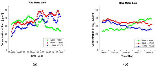 Figure 2 depicts PM2.5 concentrations for the three time intervals for both red and blue metro lines. In the first time interval, the concentration highlighted an increase at the first stops of the route. Concerning the red line, a peak concentration equal to 43 μg/m3 and an average of 34 μg/m3 were recorded. Similarly, concerning the blue metro line, the peak concentration was recorded as equal to 40 μg/m3 and the average as equal to 31 μg/m3. In the case of the second and the third time intervals, concentrations show a significant increase in the second half of the trip using the red metro line, with the second time interval presenting an average concentration equal to 39 μg/m3 and a peak value equal to 50 μg/m3 for the red metro line, and an average concentration equal to 35 μg/m3 and a peak value equal to 39 μg/m3 for the blue metro line. The third time interval presents an average value equal to 34 μg/m3 and a peak value equal to 48 μg/m3 for the red metro line, and an average value equal to 30 μg/m3 and a peak value equal to 37 μg/m3 for the blue metro line.