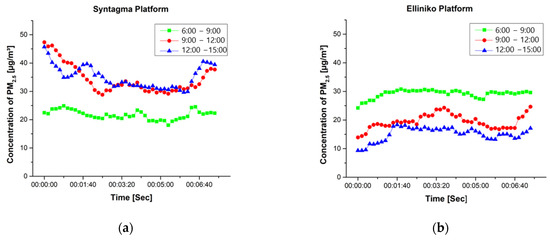 Average PM2.5 concentrations for the three time intervals—Syntagma platform (a). Average PM2.5 concentrations for the three time intervals—Elliniko platform (b).