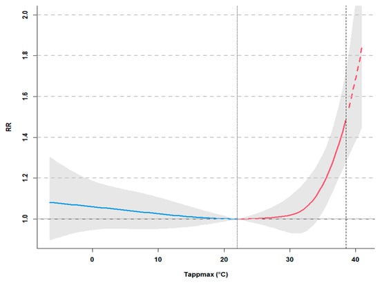 Exposure–response curve with 95% empirical confidence intervals (gray area). The dotted vertical line corresponds to Minimum Mortality Temperature (MMT, 22 °C), which defines the cold and heat (blue and red, respectively) portions of the curve. The dashed part of the curve represents the extrapolation beyond the Tappmax observed in 2006–2010 (dashed vertical line).