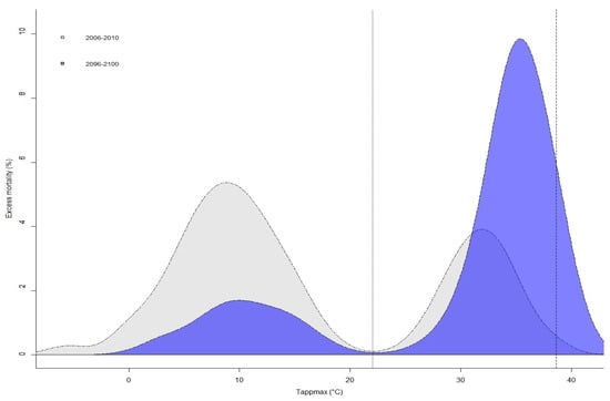 The distribution of estimated attributable mortality for the historic and future period in Thessaloniki under the assumption of stable populations and no changes in vulnerability is shown in Figure 2. The mortality burden due to heat, corresponding to Tappmax values below MMT, is larger (6%) than that for Tappmax values above MMT (cold, 4%) in the current climate (2006–2010, grey). When assessing the future (2096–2100, blue), heat-attributable mortality by far exceeds cold, reaching 10% in contrast to nearly 1%. Comparing the estimates between the two periods, heat-attributable mortality will substantially increase in the future by 6%, whereas mortality due to cold will be reduced by 5%.