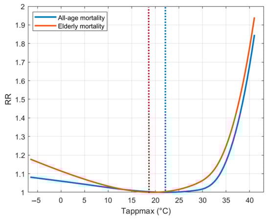 When assessing the temperature–mortality relationship explicitly for the elderly (>65 years), a consistently higher RR along the Tappmax range compared to all ages is observed, as shown in Figure 3. Indicative of the fact that the older population of Thessaloniki is more vulnerable to temperature than the general population, MMT decreases from 22 °C to 19 °C, showing lower acclimatization.