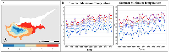 According to K-means clustering analysis, due to their significant influence from elevation, the climate characteristics of the island are divided into five classes (Figure 1—left panel) with the climatic pattern presenting many similarities to the topographic map. The results of the trend seasonal analysis reveal that Cyprus presents a gradual increase in the summer maximum and minimum temperatures for the period 1981 to 2018, which is in agreement with global and regional warming patterns. As shown in Figure 1 (right panel), these increasing trends are visible in all classes.