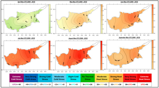 UTCIdaily was used to examine the spatial variability of thermal comfort of humans for a better representation of biothermal conditions. Figure 2 shows the spatial distribution of mean maximum monthly values of UTCIdaily for the period 2004 to 2019. A center with high values of UTCIdaily is observed in the middle of the island, near Nicosia, the capital of Cyprus. It is probably related to the Urban Heat Island (UHI), specific climatic conditions that prevail in a large metropolitan area. The highest UTCIdaily values, corresponding to category “Strong Heat Stress”, are recorded in August, followed by July, September and June. May is mostly on the “Moderate Heat Stress” category and April is characterized with “No thermal stress” (Figure 2).