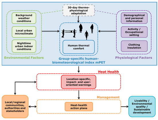 In the background of global climate change, the eastern Mediterranean region is facing an increased occurrence of intense and long-lasting heat waves [1]. Future climate projections also indicate that such extremes will be the norm for the eastern Mediterranean countries in the course of the 21st century [2]. In view of the above climatic trends, a critical public health concern emerges, as the increasing exposure of the population to extreme heat is associated with excess mortality [3,4]. Assisting society to cope with extreme heat requires early response systems, addressing the most vulnerable and considering the diversity of the human thermal perception within cities. In this direction, heat–health warning systems (HHWSs) have been found to significantly contribute to minimizing the negative health effects of overheating [5,6].