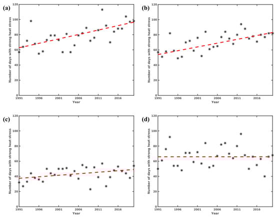 Annual number of days with strong heat stress (defined as days with maximum mPET greater than 35 °C) from 1991 to 2020 at the regional units of (a) Serres, (b) Corinthia, (c) Heraklion and (d) Ioannina. The red dashed lines correspond to the mPET trends calculated by applying the Theil-Sen estimator [12].