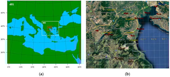 The NWP system is based on the non-hydrostatic Weather Research and Forecasting model with advanced research dynamics (WRF-ARW version 4.3.3). It employs three (1-way) telescoping nests to cover: (i) Europe, the Mediterranean Sea and Northern Africa (d01), (ii) a large part of Greece (d02) and (iii) Central Macedonia and parts of Thessaly and Western Macedonia (d03), at horizontal grid spacings of 9 km, 3 km and 1 km, respectively (Figure 1a). The initial and boundary conditions were provided by the NCEP/GDAS (National Centers for Environmental Prediction/Global Data Assimilation System) analyses (0.25° × 0.25°). The topography and land use were based on the high-resolution datasets of the United States Geological Survey (USGS). The microphysics, cumulus convection, radiation, boundary layer, surface layer and soil processes were parameterized by the WSM6, Kain-Fritsch (only in d01), RRTMG, Mellor-Yamada-Janjic, Eta and NOAH schemes.