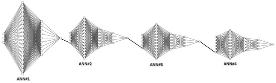 The above-measured meteorological parameters from the two courtyards, such as air temperature (°C) and relative humidity (%), were combined with the corresponding air temperature and relative humidity values for the same time period (July and August 2019), measured by the standard meteorological station belonging to the National Observatory of Athens (NOA). Then, the whole dataset was used for the appropriate ANNs training. More concretely, four different ANNs models were trained and developed (Figure 1). The first (ANN#1) was developed in order to predict air temperature in the small courtyard, for the period June–September, on an hourly basis. The second model (ANN#2) was developed in order to predict relative humidity in the small courtyard for the period June–September on an hourly basis. The third model (ANN#3) was developed in order to predict air temperature in the large courtyard, for the period June–September on an hourly basis, and finally the fourth and last model (ANN#4) was developed in order to predict relative humidity in the large courtyard for the period June–September on an hourly basis. At this point, it has to be mentioned that the output of each model was used as the input for the next model (Figure 1).