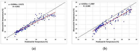 After the application of linear regression analysis between the observed and the predicted values for the four different ANNs models, Figure 2 and Figure 3 were developed. Figure 2 presents the scatterplots between the observed and predicted values of air temperature according to the TeS, for both the ANN#1 and ANN#3 models.