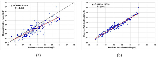 Figure 3 depicts the scatterplots between the observed and predicted values of air relative humidity according to the TeS, for both ANN#2 and ANN#4 models.
