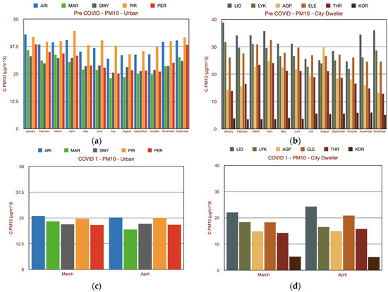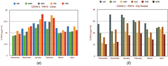 (a) Monthly average concentration values of PM10 in the atmosphere, during the pre-COVID period (urban stations); (b) monthly average concentration values of PM10 in the atmosphere, during the pre-COVID period (suburban stations); (c) monthly average concentration values of PM10 in the atmosphere, during the first lockdown period (urban stations); (d) monthly average concentration values of PM10 in the atmosphere, during the first lockdown period (suburban stations); (e) monthly average concentration values of PM10 in the atmosphere, during the second lockdown period (urban stations); (f) monthly average concentration values of PM10 in the atmosphere, during the second lockdown period (suburban stations).