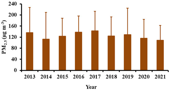 The annual mean concentrations of PM2.5 are depicted in Figure 1, and the time-series plots of major and trace elements of PM2.5 are presented in Figure 2a,b. The mean annual concentration of PM2.5 was 127 ± 58 µg m−3 with a maxima of 143 ± 70 µg m−3 (in 2017) and a minima of 109 ± 53 µg m−3 (in 2021) during the entire sampling period. The non-significant decreasing trend (y = −1.63x + 133.9; R² = 0.15) in annual concentrations of PM2.5 was observed from 2013–2021. The annual mean concentrations of PM2.5 was recorded more than three times that of National Ambient Air Quality Standards (NAAQS, annual level: 40 µg m−3). Out of the 19 elements, the higher concentrations of major elements such as K, Al, Fe, Ca, Na, Mg, and S in PM2.5 were recorded in Delhi. Other studies also reported similar observations [1,5,10,11,12,13,14]. The highest loading of elements was recorded in 2015 (19% of PM2.5), and the lowest in 2020 (9% of PM2.5) might be due to limited activity during COVID-19 lockdown/unlock times. The total concentrations (∑El) of elements in PM2.5 accounted for 13.9% of PM2.5 during 2013–2021 in Delhi. Similar observations were reported by Jain et al. [10] and Rai et al. [1] with a 17% and 19% contribution of elements in PM2.5 over Delhi.