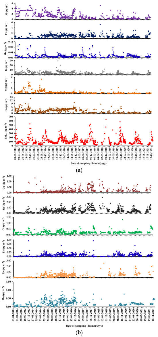 (a). Time-series plots of major elements present in PM2.5 in Delhi from 2013–2021. (b). Time-series plots of trace elements present in PM2.5 at Delhi from 2013–2021.