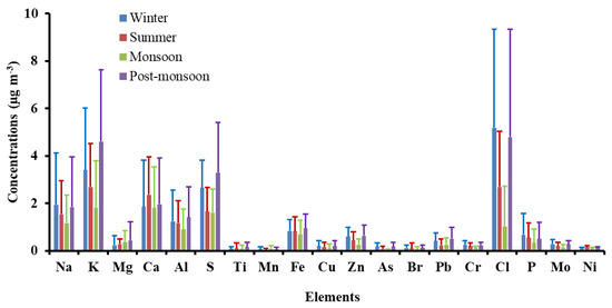 Seasonal elemental concentrations (Al, Fe, Ti, Cu, As, Zn, Mn, Cr, Ni, P, Mo, Na, Mg, Cl, S, K, Pb, Br, and Ca) of PM2.5 are depicted in Figure 3, whereas the seasonal percentage contribution of elements in PM2.5 is illustrated in Table 1. The percentage of elements contributing to PM2.5 during the winter, summer, monsoon, and post-monsoon seasons was computed as 12.9%, 16.9%, 16.6%, and 11.7%, respectively. A higher loading of elements in PM2.5 during the summer (16.9%) and monsoon (16.6%) seasons is due to occasional dust storms, higher wind speeds, and long-distance transit of pollutants from the Thar desert and neighboring areas to the receptor site of Delhi [4,15,16]. The higher loading of Al, Fe, Ti, Ca, and Na in PM2.5 found during all the seasons at the sampling site is attributable to mineral/soil dust [14,15,16]. During the post-monsoon season, a higher concentration of Cl was found, which could be attributed to the combustion of coal and the burning of wood, plastic, paper, diesel fuels, etc. [14,17,18].