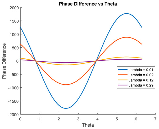 Figure 6 illustrates the phase difference up to 20 GHz, using wavelength 0.01 in blue, 0.02 in red, 0.12 in yellow, and 0.29 in purple respectively to ensure the relation with different frequencies.