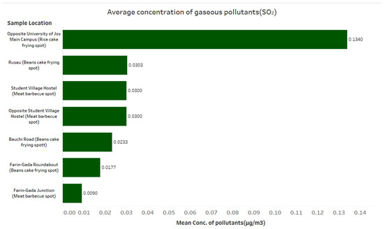 For the concentration of CO as shown in Figure 1, Rusau had extremely hazardous levels, while the university campus and Student Village Hostel had hazardous levels. Bauchi Road and Farin-Gada Roundabout had unhealthy levels of emission for sensitive groups, and Farin-Gada Junction and Student Village Hostel had moderate levels.