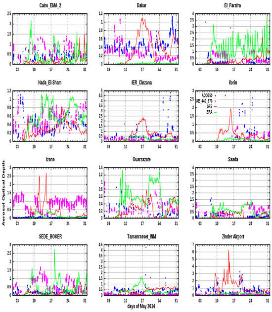 As shown in Figure 1, the behavior of DOD using GFS and ERA-Interim was not consistent in most cases in the selected stations; however, approximately the same behavior was found at the station of IER_Cinzana during the period of 14–20 May 2014, with different values of DOD; with GFS, DOD exceeded 2, but with ERA-Interim its value was less than 0.5, which was more consistent with the AOD obtained with AERONET. At the station of Izana, DOD resulting from ERA-Interim was near the measured AOD value, whereas at the stations of Cairo_EMA_2, Dakar, El_Farafra, Hada_El-Sham, Saada, and SEDE_BOKER, RegCM4.4 with GFS provided DOD values near the observed ones. Moreover, at Zinder_Airport station, RegCM4.4 using GFS captured high values of DOD on 9 and 21 May 2014, which agreed with the AERONET data and the measured Ångström exponent (AE) (AE_440-870 < 0.5), indicating that the high values of AOD corresponded to dust events. In contrast, RegCM4.4 with ERA resulted in lower values of DOD.