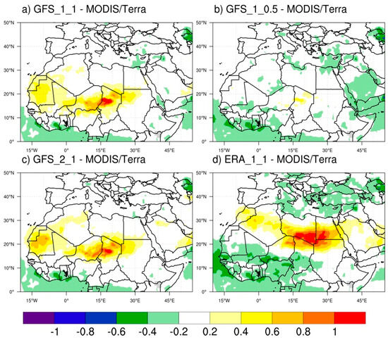 The differences between the average DOD values calculated over the whole studied period simulated in four different experiments: (a) GFS_1_1 (GFS and scheme1 with erodibility factor = 1), (b) GFS_1_0.5 (GFS and scheme1 with erodibility factor = 0.5), (c) GFS_2_1 (GFS and scheme2 with erodibility factor = 1), (d) ERA_1_1 (ERA−Interim and scheme1 with erodibility factor = 0.5), compared to AOD values from Terra.