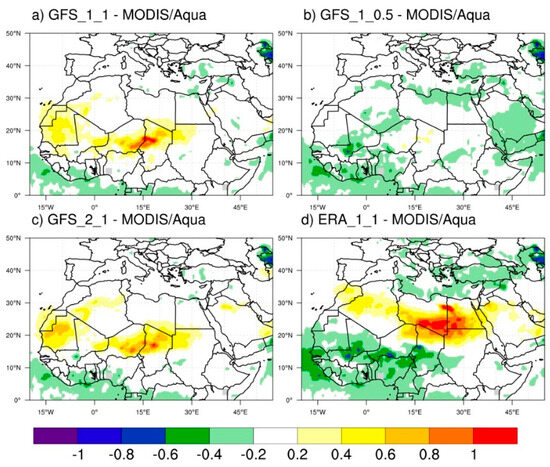 The differences between the average DOD values calculated over the whole studied period simulated in four different experiments: (a) GFS_1_1 (GFS and scheme1 with erodibility factor = 1), (b) GFS_1_0.5 (GFS and scheme1 with erodibility factor = 0.5), (c) GFS_2_1 (GFS and scheme2 with erodibility factor = 1), (d) ERA_1_1 (ERA−Interim and scheme1 with erodibility factor = 0.5), compared to AOD values from Aqua.
