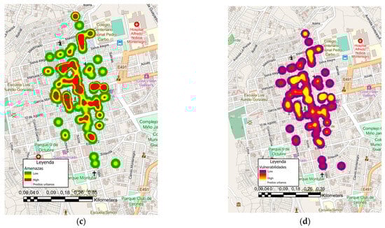 Figure 2. Thematic maps of the location of Guaranda (a), patrimonial goods (b), hazard (c), vulnerabilities (d).