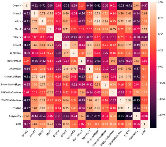 r-Pearson correlation of rice yield and phenological metrics.