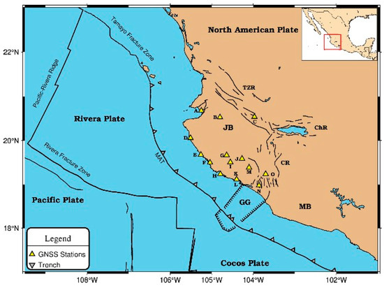 Study area map with yellow triangles representing GNSS stations. JB: Jalisco Block. MB: Michoacan Block. GG: El Gordo Graben. CR: Colima Rift. TZR: Tepic-Zacoalco Rift. ChR: Chapala Rift.