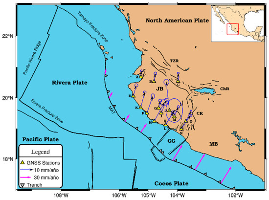 The velocities obtained in our study suggest a counterclockwise rotation of the JB, with a preferential direction towards north-northwest in most stations, which agrees with the subduction direction estimated by the Rivera plate movement model proposed by DeMets et al. [21]. The above shows the influence of the movement of the Rivera plate on the movement of the Jalisco Block.