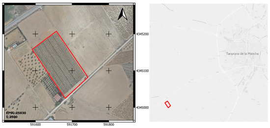 The vineyard was chosen because it plays a very important role in Castilla–La Mancha, as not only the largest vineyard in the country, but also in the world, with a surface area of more than 465,000 hectares, which represents practically 50% of the total vineyard are for wine-making in Spain [4]. Figure 1 shows the vineyard chosen as a case study in the southwest of the town of Tarazona de la Mancha, in the province of Albacete, with an area of just over 1.3 hectares and 24 rows of vines.