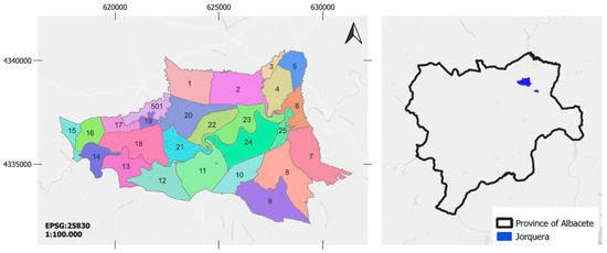 The lack of updating of cadastral ownership is an issue that mostly concerns rural properties in a rural environment. Cadastral plots in rural areas, where depopulation is also a major challenge, often suffer from this problem. For this reason, a town in La Mancha, with less than 300 inhabitants, in the province of Albacete, called Jorquera, has been selected as the case study. The municipality of Jorquera, of some 68 square kilometres, is divided into 28 cadastral polygons, as shown in Figure 1.