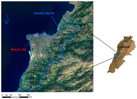 Lebanon is a small country on the eastern coast of the Mediterranean Sea, with a total land area of 10,452 km2. The study area is in Lebanon’s central coastline region, the Greater Beirut area (GBA), which has a total size of 233.2 km2, accounting for 2.2% of the Lebanese territory. As shown in Figure 1, GBA stretches towards the south, east, and north of Beirut. It is bounded by the Mediterranean from the west. GBA’s topography increases in elevation from the west coastline at 0 m and extends to an elevation of 989 m. Due to demographic and economic growth pressures, many areas in GBA are transformed from green spaces, forests, and agricultural regions into residential structures, industrial areas, and other public facilities. The direct influence was to reduce the forested lands and increase surfaces with asphalt and concrete, which are utilized in urban construction and considered impermeable materials that absorb and store solar radiation [8].