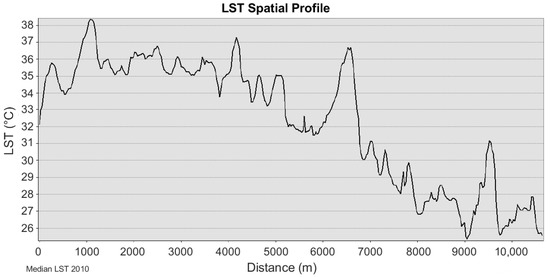 Furthermore, the elevation influences temperature, which decreases with higher altitudes. GBA has an elevation ranging from 0 m (Mediterranean Sea level) to 989 m. Based on the LST statistics according to land’s altitude, the highest LST values with a mean of 34.36 °C are recorded at the lowest altitudes between 0 and 100 m at the coastal area, even if it is away by a 6 km distance. This is aligned with the fact that the population distribution increased the urbanized areas by a factor of 3 [9]. Although the highest altitude in Lebanon exceeds 3000 m, a big percentage of the population (up to 70%) lives at elevations of less than 200 m. For example, by having a closer look at the LST median values in 2010, we take a topographic profile in GBA as illustrated in Figure 3. It goes from the west coastline at 0 m to an endpoint (a region called Ain Saade) at a distance of 10,500 m to the east, and an altitude of 614 m. As illustrated in Figure 3, going up to 5900 m away from the coastline, the elevation of the land only increases to 50 m. It further dramatically increases to 614 m between the distance of 6000 and 10,500 m.
