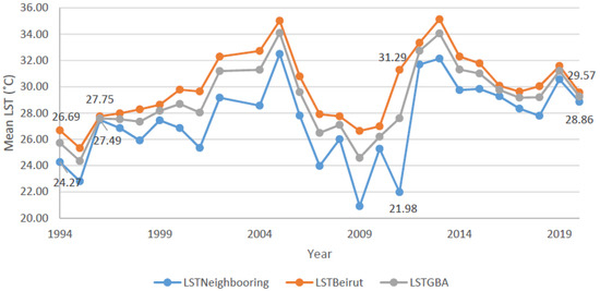 To confirm this correlation between the cooling effect of the vegetation growth and LST values, we compare the LST values of the Beirut district to its adjacent urban and rural borders in GBA as shown in Figure 5 as more evidence of the vegetation’s low LST values and urban areas’ high LST values. For this, we calculate the mean LST values for the Beirut district (in orange) and its rural surrounding areas (in blue) to assess their contributions to the LST values for GBA (in gray). These values over the three decades are presented in Figure 6. Results show that the highest LST values are recorded in the Beirut district’s urban area and increased by 2.88 °C from 26.69 °C in 1994 to 29.57 °C in 2020, while the lowest values are in adjacent rural areas, which increased by 4.59 °C from 24.27 °C in 1994 to 28.86 °C in 2020. LST values for the GBA are the combination of both previous values of the two regions with a total increase of 3.52 °C, from 25.73 °C to 29.25 °C. This demonstrates that the temperature in the vegetation area is lower than in the urban area. A noticeable point here is that LST values increased on average over the three decades more in the surroundings of Beirut than the district, which further highlights the urbanization witnessed in the rural surrounding areas of the Beirut district.