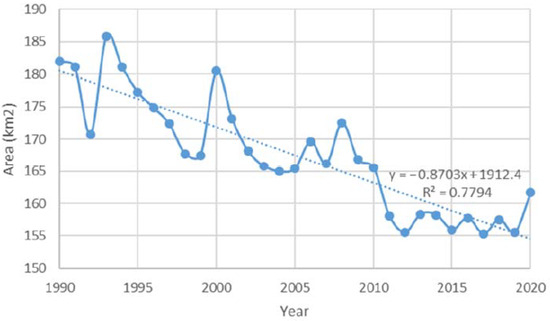 To detect plant growth and vegetation dynamics, we analyze the evolution of green areas in the same GBA area over the three decades as shown in Figure 7. Results show that due to human expansion, urbanization has reduced the vegetation in the GBA with a 20 km2 drop in green areas from 181 to 161 km2 over the three decades. Figure 7 also shows how this evolution over the years is approximated by the linear regression model (dashed data line) with the coefficient of determination, R2, of 0.7794.