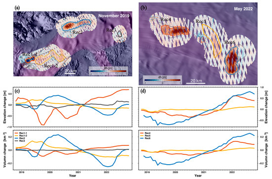 Spatial and temporal changes of the subglacial lakes in the RIS. Maps of subglacial lake surface-height anomalies for (a) RIS downstream during October 2019–December 2019 and (b) RIS upstream during April 2022–June 2022, with the derived subglacial lake time series for (c) Rec1-1, Rec1-2, Rec2, Rec3, and (d) Rec4, Rec5, and Rec6. The derived new lake outline colors in (a,b) correspond to the time series in (c,d). The lake outlines of Siegfried et al. appear as black blocks with 70% transparency. The white arrows indicate the direction of the RIS.